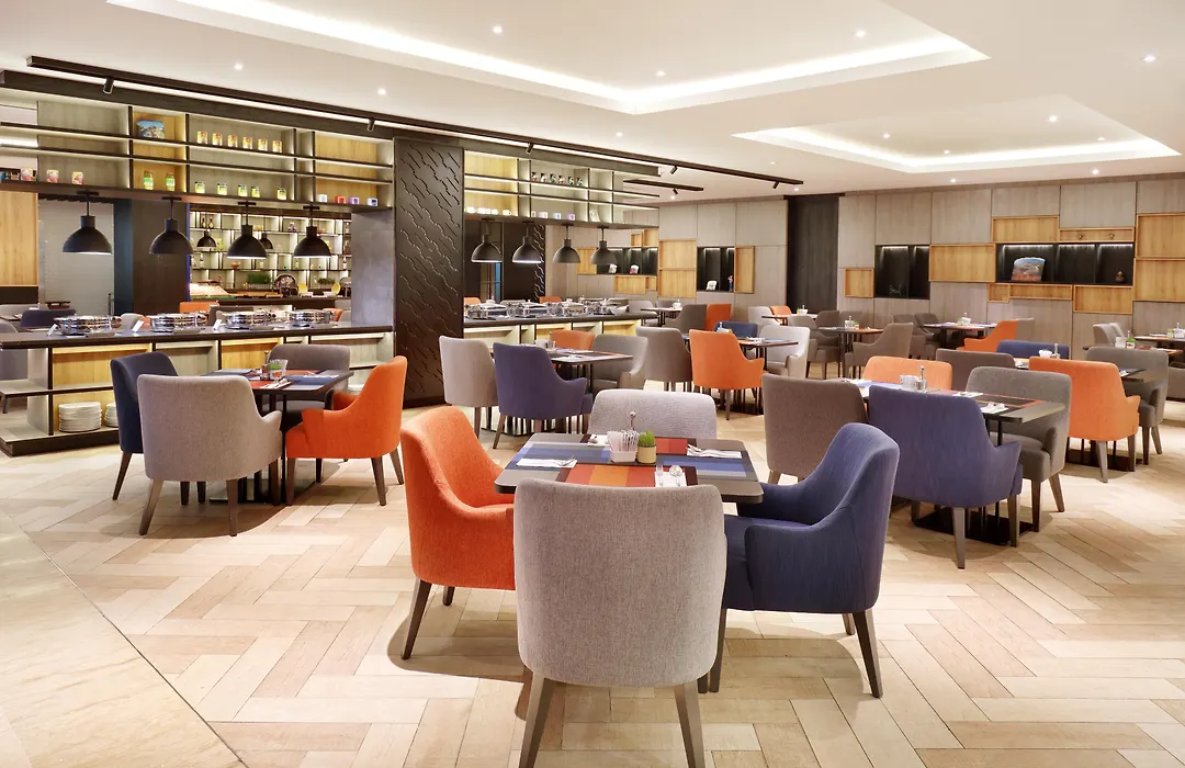 Hotel menawarkan sarapan prasmanan gratis, disajikan di restoran. Para tamu dapat menyantap makanan mereka ditemani dengan minuman segar di bar snack. Para tamu dapat menikmati makanan di Pappa Jack Kopitiam dan After Five Beer and Steak yang berjarak sekitar 5 menit berjalan kaki dari Novotel Jakarta Mangga Dua Square.